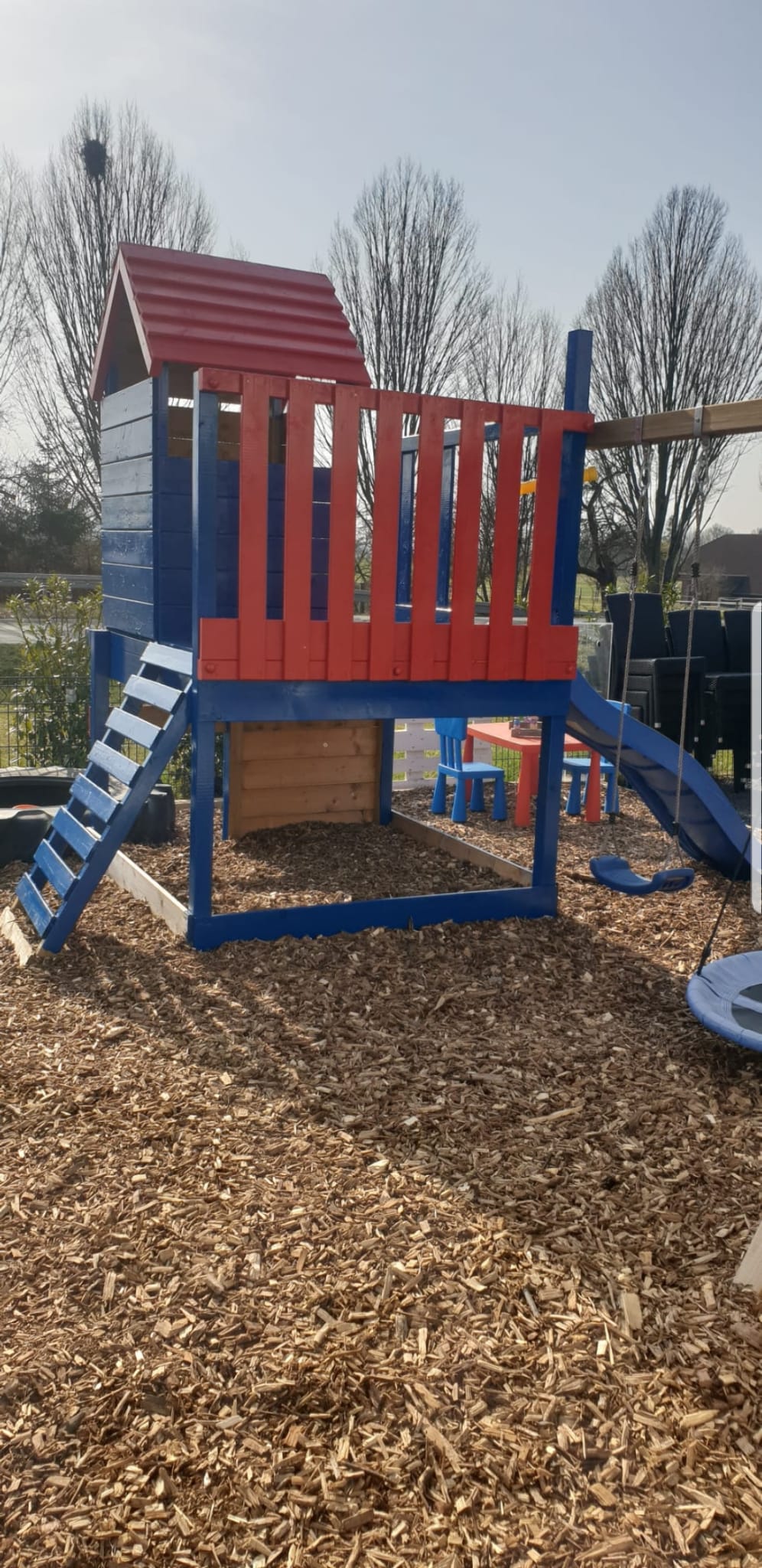 Auf unserer Wiese könnt Ihr Ball spielen, Sackhüpfen, Eierlaufen und vieles mehr. Oder auf unserem kleinen Kletterturm klettern, schaukeln und rutschen.